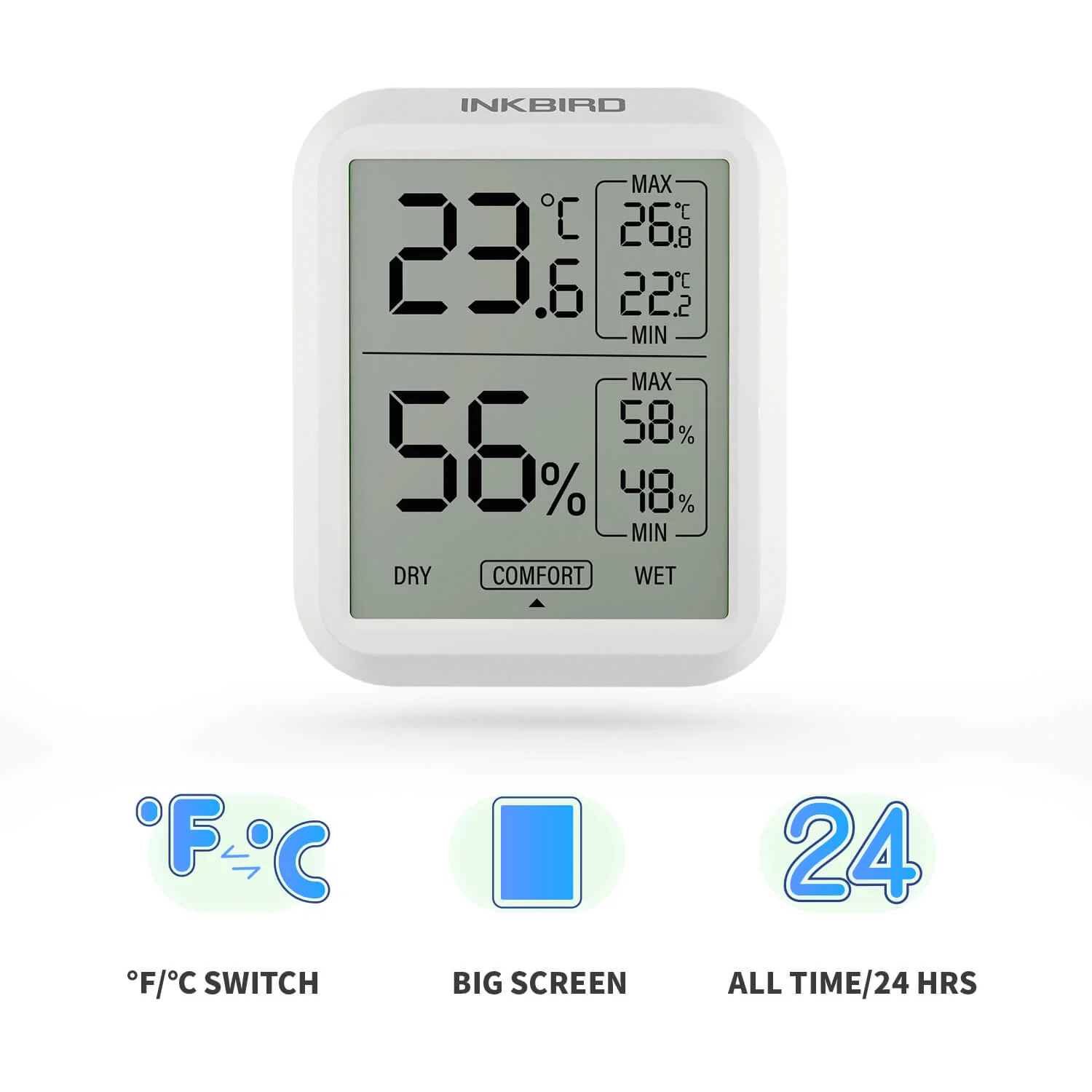 LCD display screen: INKBIRD ITH-20 adopts LCD display screen to show temperature and humidity and divides it into two parts, one to display temperature and the other to display humidity, besides, it applies comfort and user friendly indicators, which makes it cozy and comfortable to use.